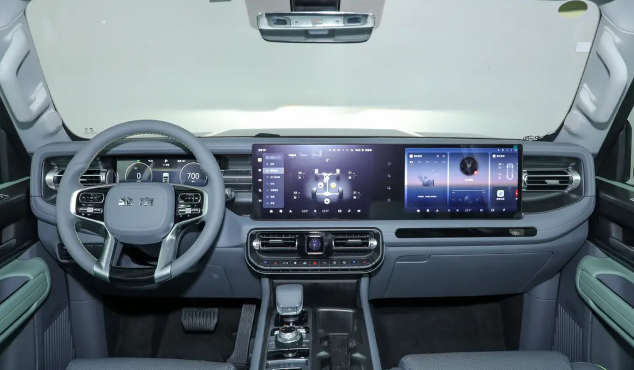 内饰方面的改变让车辆焕然一新。多数部位都采用了软包设计来呼应外观设计,内饰细节上还加入了橙色元素,营造出更好的质感和舒适度,内饰更具有档次感。这款车比较符合城市SUV的定位。当然,全新BJ40冠军版配备了10.25英寸全液晶仪表,以及12.8英寸双中控屏+副驾屏。该车搭载了高通骁龙8155芯片,中控屏下方保留了传统的空调调节按钮。新车还配备了四向电动调节真皮方向盘,带有加热和记忆功能。其他配置方面,新款BJ40冠军版提供哈曼卡顿音响(带ANC主动降噪功能)、加热/通风/按摩/记忆/电动调节座椅、后备箱220伏电源等。此外,该车还可选配女王副驾以及L2级辅助驾驶功能。